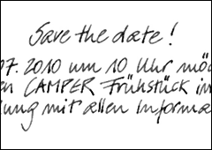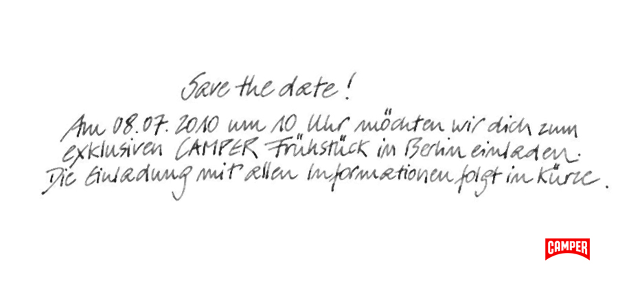 Im Rahmen der FashionWeek lädt Camper rund 40 VIPs der Blogger-Szene zum spanischen Frühstück in den Berliner Flagship Store. Mit dabei sind die Camper-Leitung und ihre wichtigsten Schuhdesigner. Der Clou: Die Gäste, digital bestens vernetzt, bekommen handschriftliche Einladungen per Post – und vorab ein Save the Date.